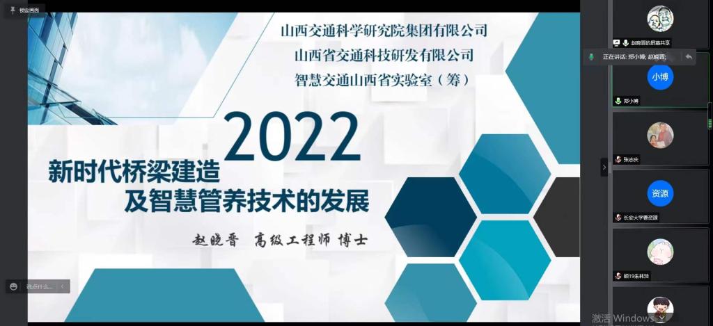 2022年1月7日,学院“智慧桥梁”实践育人团队在线上举办研究生学术报告会,邀请山西省交通科技研发有限公司桥梁与隧道工程研究院副院长赵晓晋高级工程师做《新时代桥梁建造及智慧管养技术的发展》学术报告。报告会由桥梁工程系副主任周勇军教授主持。