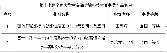 第十七届全国交通运输科技大赛共计177所高校的1473件作品参赛,94所高校共213件作品进入决赛,入围率仅14%。本年度进一步将研究生赛道精细化分为博士生、硕士生两个分赛道,其中博士生赛道全国仅7件作品入围决赛。王朝辉教授指导的作品《面向低碳能源的智能道路压电发电装备研发及应用》在博士生赛道中获得唯一的全国一等奖,这是我校目前在本项赛事研究生赛道中获得的最好成绩。栗培龙教授、丁湛副教授指导的作品《基于“路—车—雨”信息融合的多雨山区高速公路行车实时分析与导引系统》获本科生赛道全国一等奖,这也是继第十四届全国大学生交通运输科技大赛之后,新葡萄官网师生再一次获得本科生赛道全国一等奖。