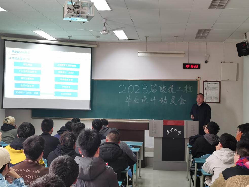 陈建勋教授从毕业设计的重要意义、基本过程、答辩程序及要求、学校管理办法及相关纪律要求、教育部抽检办法五个方面做动员。他强调指出,本科毕业设计是培养学生的工程意识、实践能力、协作精神以及综合应用所学知识解决复杂工程问题能力的有效手段,是本科人才培养环节中的最后一道重要的关卡。通过隧道工程毕业设计,学生能够掌握隧道工程设计全过程,积累一定设计经验,可为今后的学习和工作奠定扎实基础。