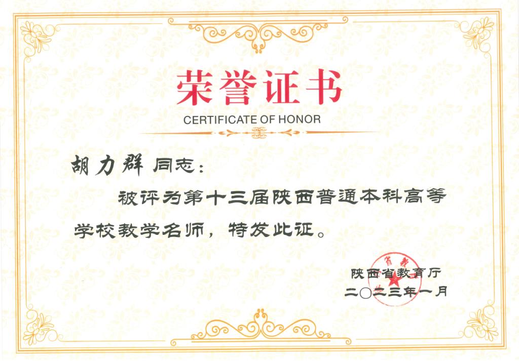 根据陕西省教育厅办公室《关于开展第十三届陕西普通本科高等学校教学名师奖评选表彰工作的通知》(陕教高办〔2022〕27号),第十三届陕西普通本科高等学校教学名师奖评选工作经学校推荐、申报公示、专家评选、厅务会审议、结果公示等工作程序,新葡萄官网道路系胡力群教授荣获第十三届陕西普通高等学校教学名师奖。