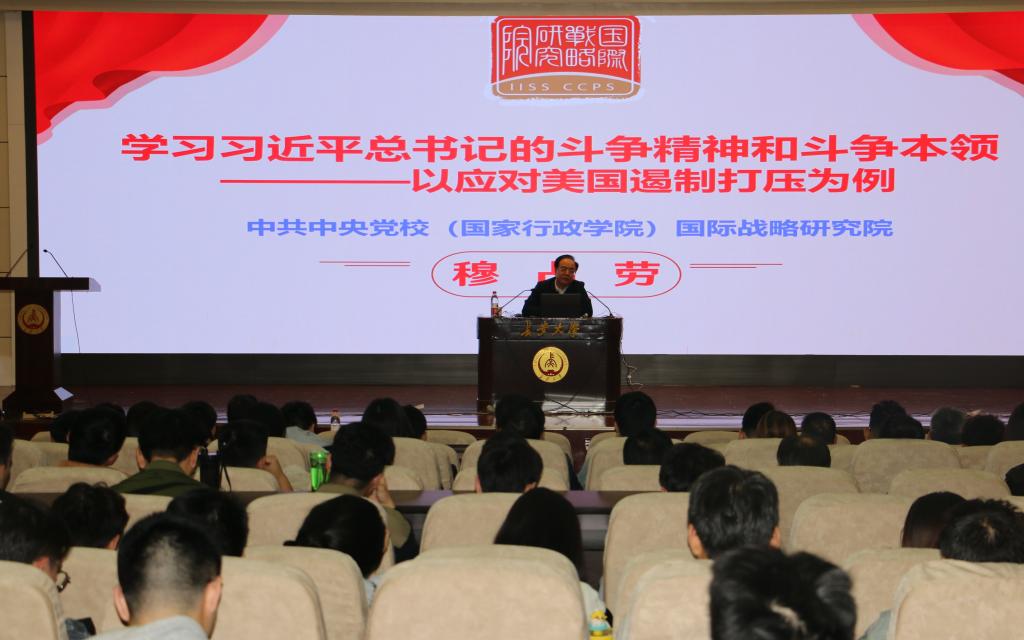 2023年10月12日下午,新葡萄8883官网AMG官网在南校区北院学术交流中心报告厅举行理论学习中心组(扩大)会议,邀请中共中央党校(国家行政学院)国际战略研究院穆占劳教授作《学习习近平总书记斗争精神和斗争本领》的专题辅导报告。学院党委理论学习中心组成员、全体教工党员和部分学生党员代表300余人共同参加了学习。辅导报告由学院党委书记汪海年主持。