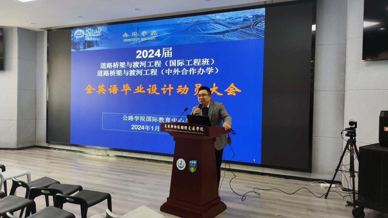 2024年1月11日下午2:00,国际教育中心召开2024届道路桥梁与渡河工程(国际工程班)、道路桥梁与渡河工程(中外合作办学)全英文毕业设计动员会。新葡萄8883官网AMG官网副院长张久鹏教授、长安都柏林国际交通学院教学教务部主任贾婕妤以及250余名师生参加动员会,会议由国际教育中心主任刘玉教授主持。