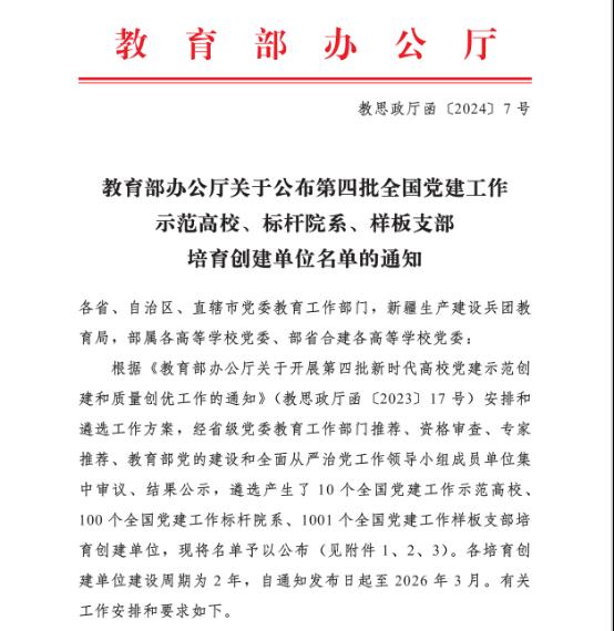 4月16日,教育部思想政治工作司发布《教育部办公厅关于公布第四批全国党建工作示范高校、标杆院系、样板支部培育创建单位名单的通知》(教思政厅函〔2024〕7号),经省级党委教育工作部门推荐、资格审查、专家推荐、教育部党的建设和全面从严治党工作领导小组成员单位集中审议、结果公示,遴选产生了10个全国党建工作示范高校、100个全国党建工作标杆院系、1001个全国党建工作样板支部培育创建单位。新葡萄8883官网AMG官网党委入选“全国党建工作标杆院系”培育创建单位。