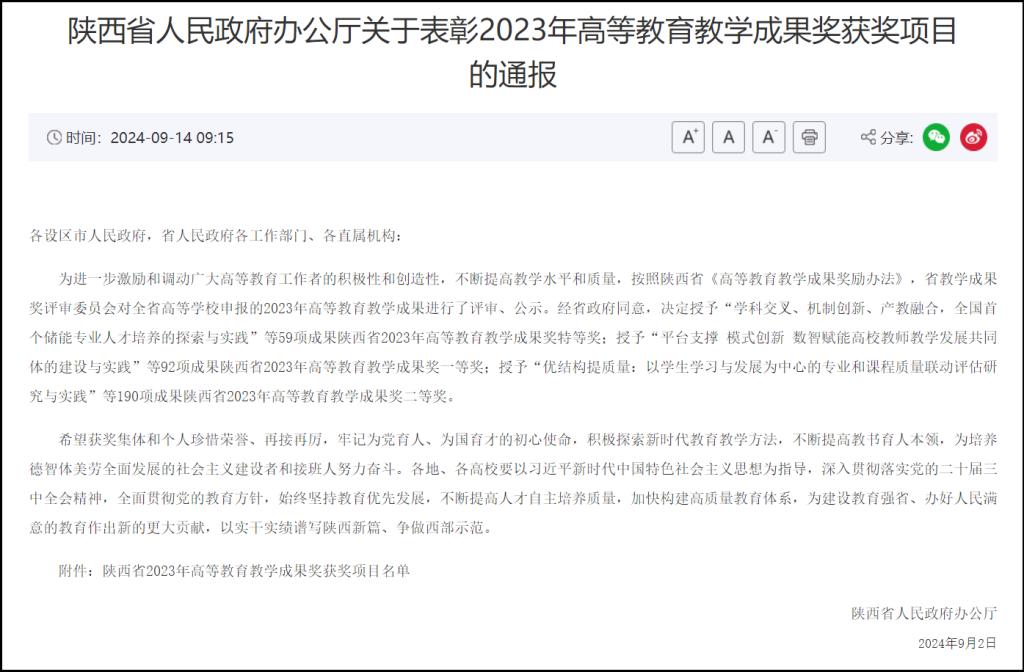 近日,陕西省人民政府发布《陕西省人民政府办公厅关于表彰2023年高等教育教学成果奖获奖项目的通报》(陕政办函〔2024〕104号),新葡萄8883官网AMG官网共3项成果获奖,其中特等奖1项,一等奖1项,二等奖1项。
