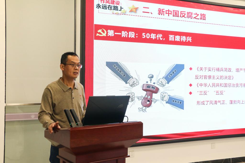 刘伟向学生们阐明了“廉洁文化”的内涵,并详细介绍了新中国从1951年底到21世纪以来经历了反腐的四大阶段,强调了我国在反腐败和廉政建设方面,坚持标本兼治、综合治理、惩防并举、注重预防的方针。接着,他带领同学们学习《中国共产党廉洁自律准则》和《中国共产党纪律处分条例》,两项法规一正一反、相互配套,目的是实现依规依纪治党,切实加强党内监督。